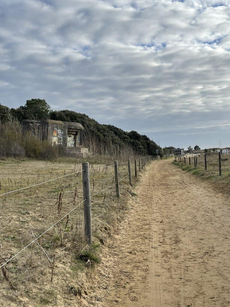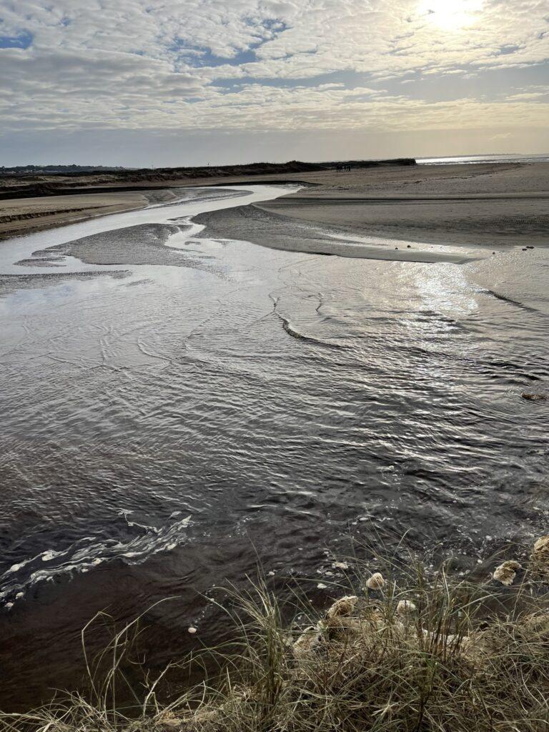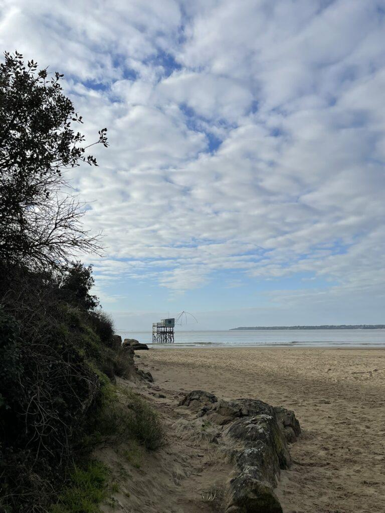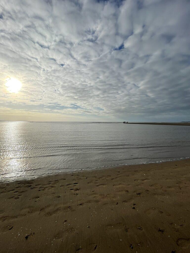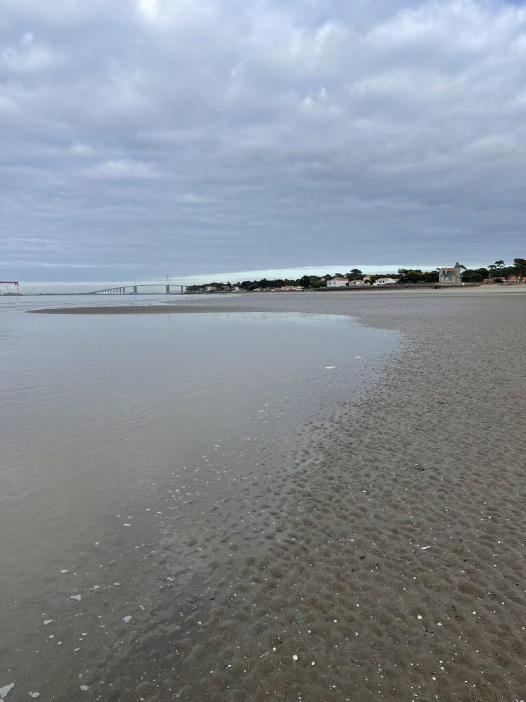 Już na pierwszych kilometrach czuć było, że to będzie marsz „nad wodą”, a nie tylko „obok niej”. Ocean tutaj nie jest tłem – on gra pierwsze skrzypce i jest głównym bohaterem. Ścieżka, a w zasadzie plaża, prowadziła mnie wzdłuż wybrzeża, raz wysoko nad wodą, raz niemal na jej poziomie. Plaże w okolicach Saint-Brevin-les-Pins są przede wszystkim szerokie i otwarte. Przy odpływie ocean cofa się daleko, odsłaniając ogromne połacie mokrego, ciemniejszego piasku, po którym idzie się lekko i równo. Krajobraz wtedy robi się niemal surowy… tylko piasek, wiatr i woda wracająca powoli swoim rytmem.