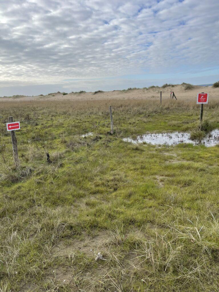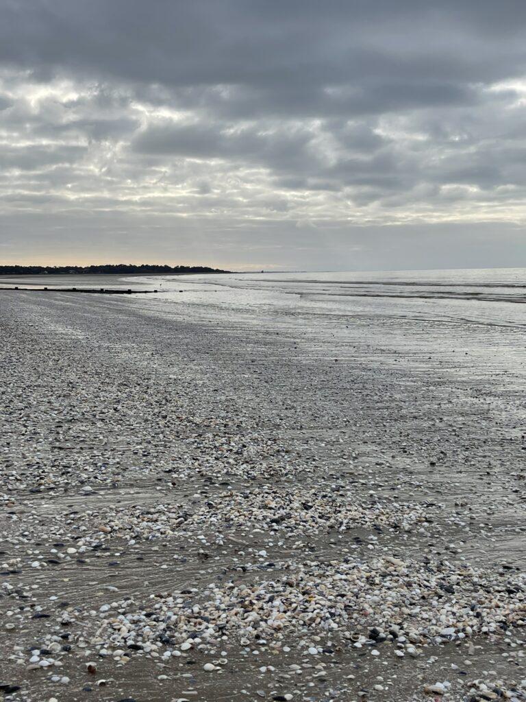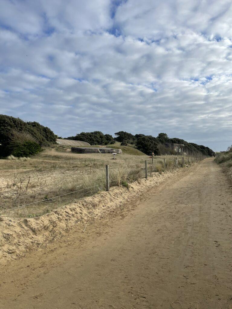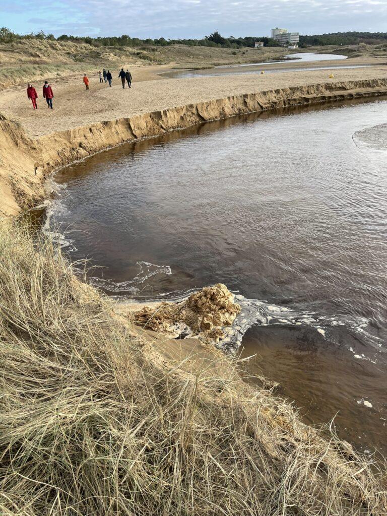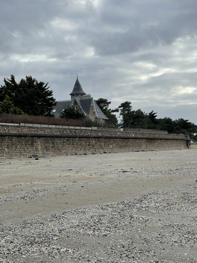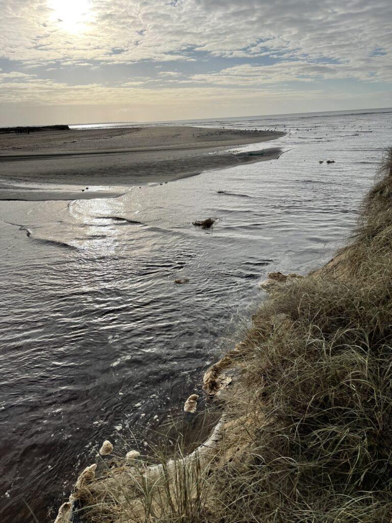 Już na pierwszych kilometrach czuć było, że to będzie marsz „nad wodą”, a nie tylko „obok niej”. Ocean tutaj nie jest tłem – on gra pierwsze skrzypce i jest głównym bohaterem. Ścieżka, a w zasadzie plaża, prowadziła mnie wzdłuż wybrzeża, raz wysoko nad wodą, raz niemal na jej poziomie. Plaże w okolicach Saint-Brevin-les-Pins są przede wszystkim szerokie i otwarte. Przy odpływie ocean cofa się daleko, odsłaniając ogromne połacie mokrego, ciemniejszego piasku, po którym idzie się lekko i równo. Krajobraz wtedy robi się niemal surowy… tylko piasek, wiatr i woda wracająca powoli swoim rytmem.