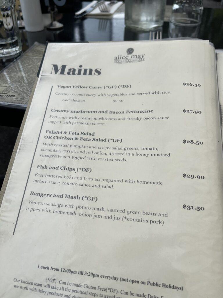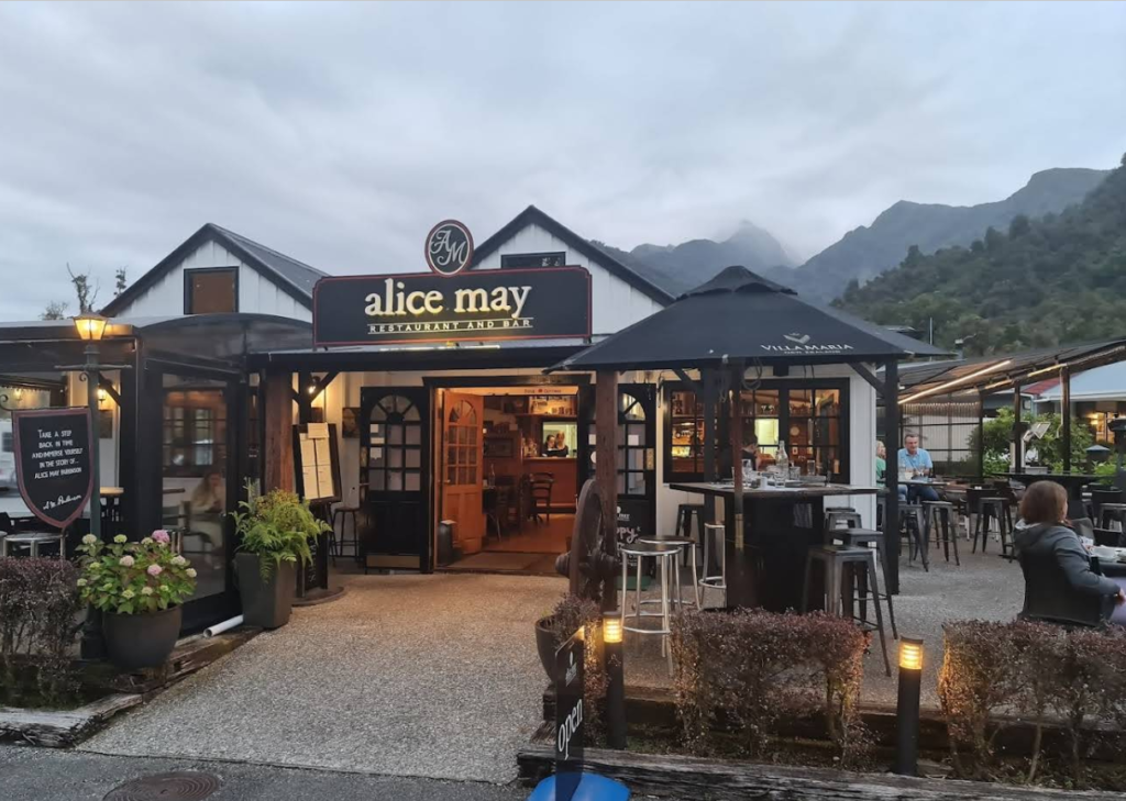 Do Franz Josef / Waiatu dojechaliśmy bez żądnych problemów już o 14-tej. Niestety gromadzące się nad nami chmury, nie zwiastowały niczego dobrego. Nic to… nadal uzbrojeni w „optymizm” ruszyliśmy coś zjeść. Padło na Alice May Restaurant, Franz Josef , całkiem spoko restaurację-bar. Tam zainstalowaliśmy swoje CSW (Centrum Sterowania Wszechświatem) i zamówiliśmy jedzonko. Nic szczególnego, ale smaczne i dużo 🙂