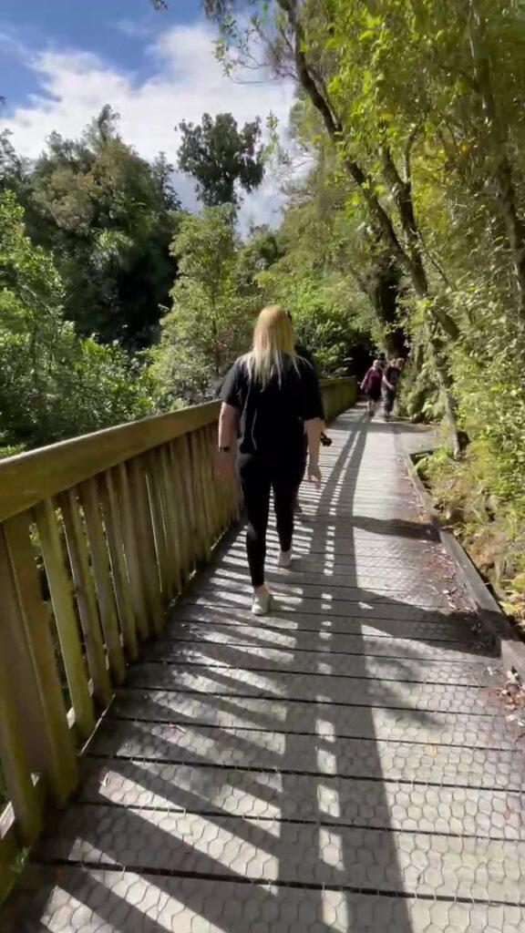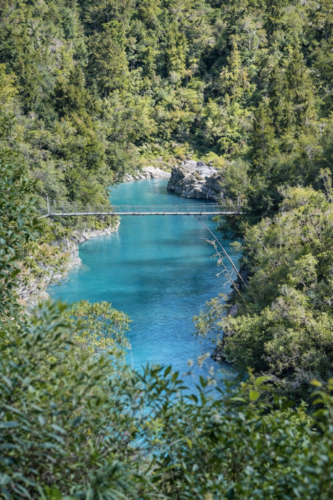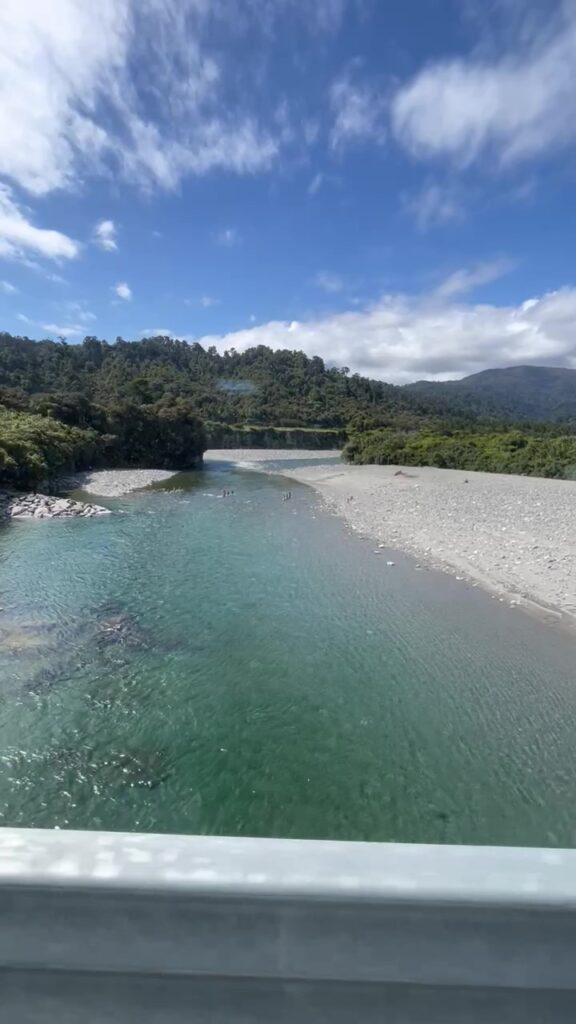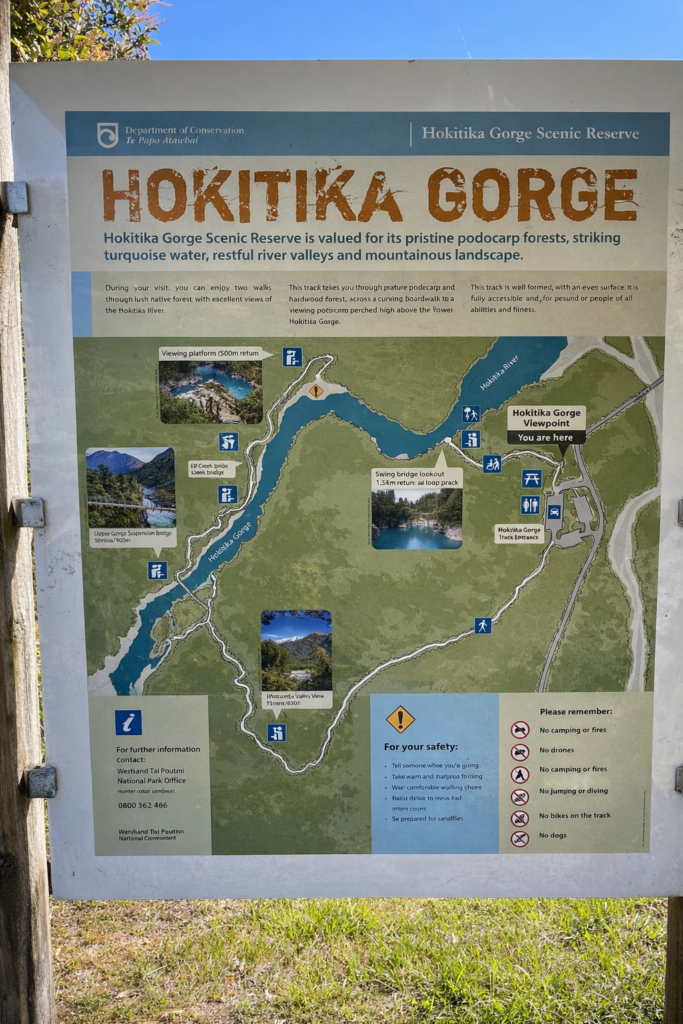 Zmierzając do Franz Josef wzdłuż Zachodniego Wybrzerza zjechaliśmy „delikatnie” (ok. 35 km.) do miejsca zwanego Hokitika Gorge. Plan był klasyczny… szybki przystanek, rzut oka i dalej w drogę. Oczywiście również jak zwykle skończyło się chwilą dłuższego patrzenia na rzekę, która wyglądała trochę zbyt idealnie, żeby była prawdziwa. Krótka ścieżka prowadzi przez wilgotny, gęsty las, aż do punktu widokowego nad wąwozem. Zasadniczo najlepiej podziwiać rzekę i wąwóż z wiszączego mostu przerzuconego nad tą turkusową rzeką, ale wciąż daje o sobie znać ten nasz „trzynasty” 🙁