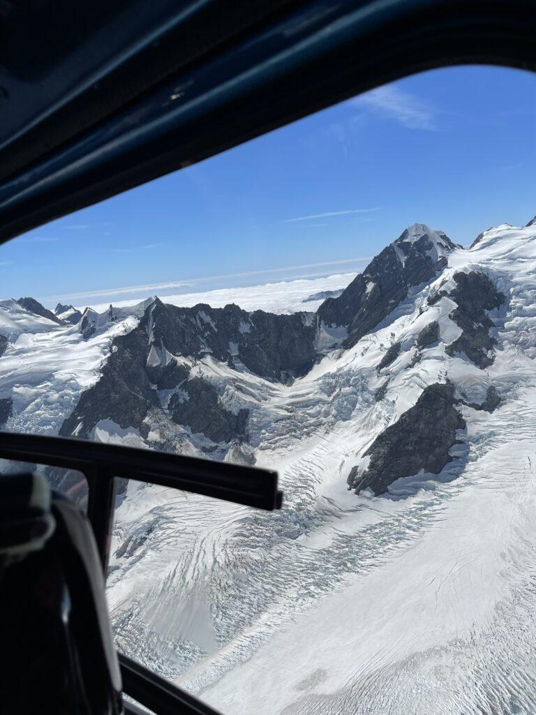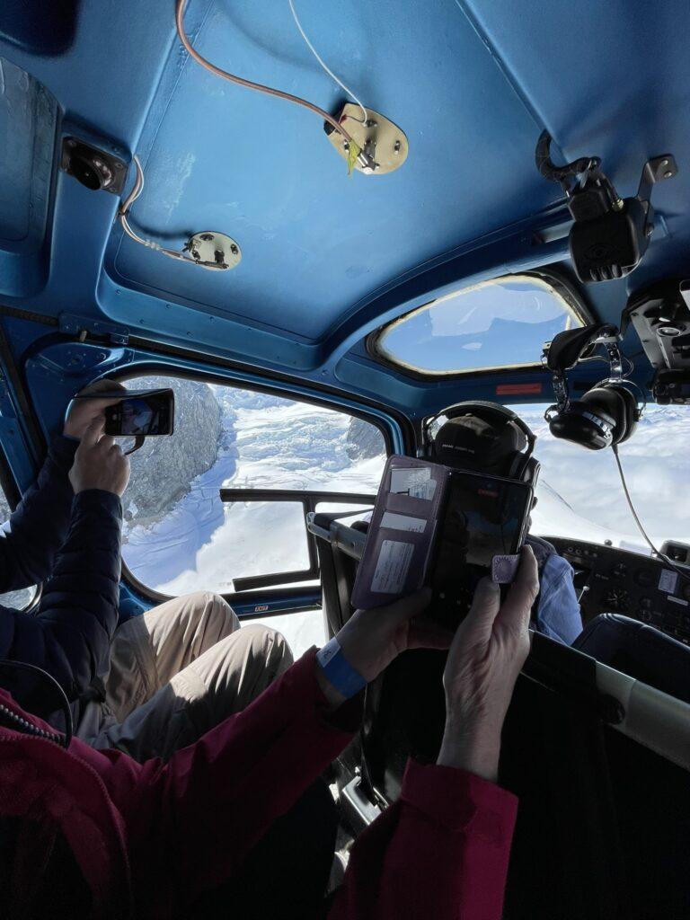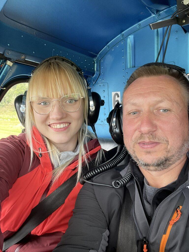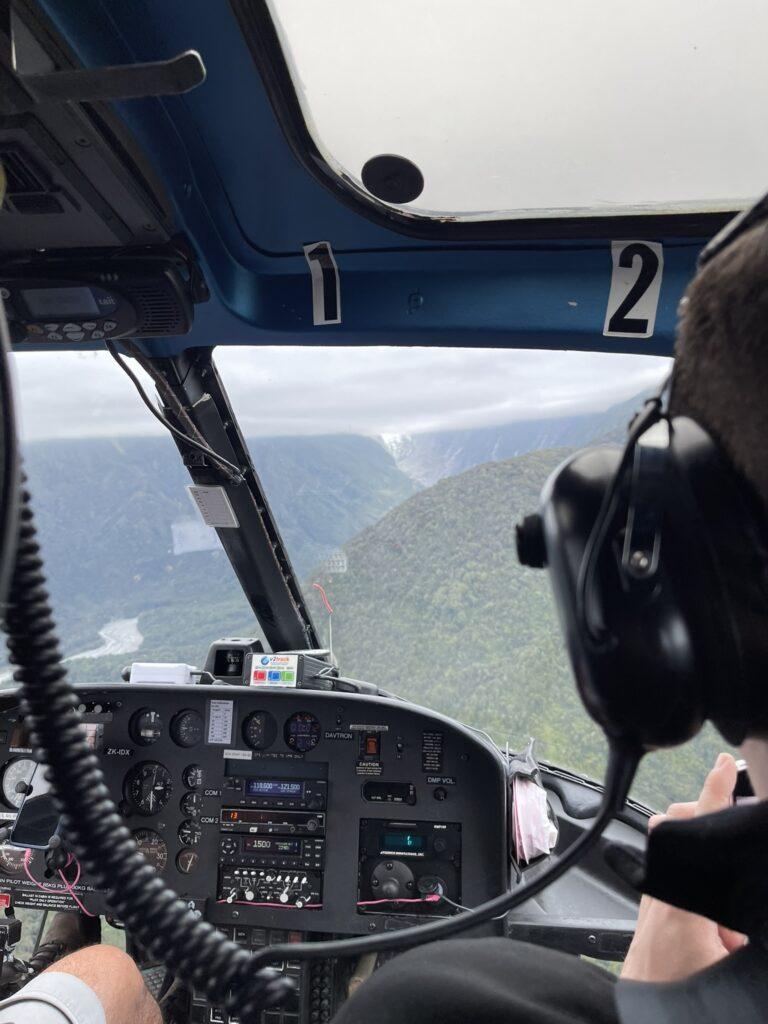 Pakujemy się do helikoptera, a w zasadzie usadza nas pilot, przypina pasy, sprawdza i daje nam słuchawki na uszy. Startujemy i kierujemy się w stronę gór, przelatując najpierw nad pastwiskami, nad rzeką i w końcu wlatujemy w dolinę prowadzącą ku lodowcowi. W helikoterze podczas lotu panuje straszliwy hałes i żeby komunikacja pomiędzy pilotem a pasażerami była cały czas zachowana, mamy właśnie na uszach słuchawki, które po pierwsze wygłuszają otoczenie, a po wtóre słyszymy w nich pilota, który opowaiada nam o trasie i o lodowcu.