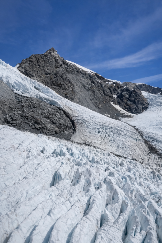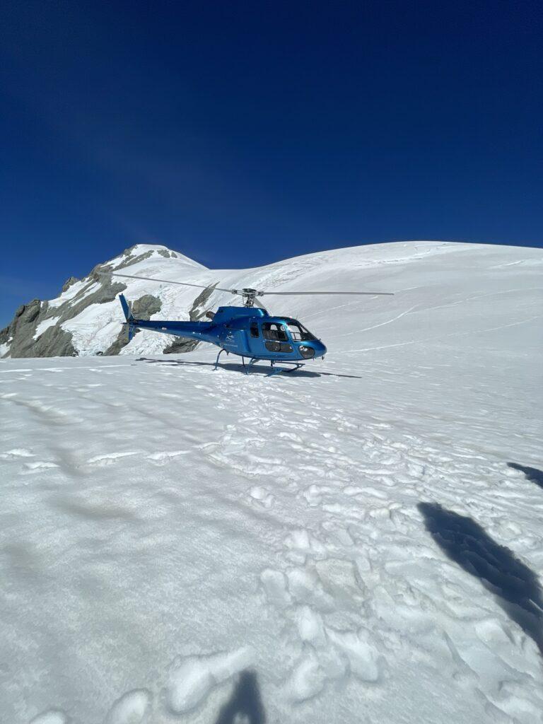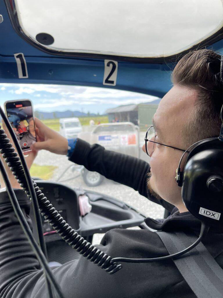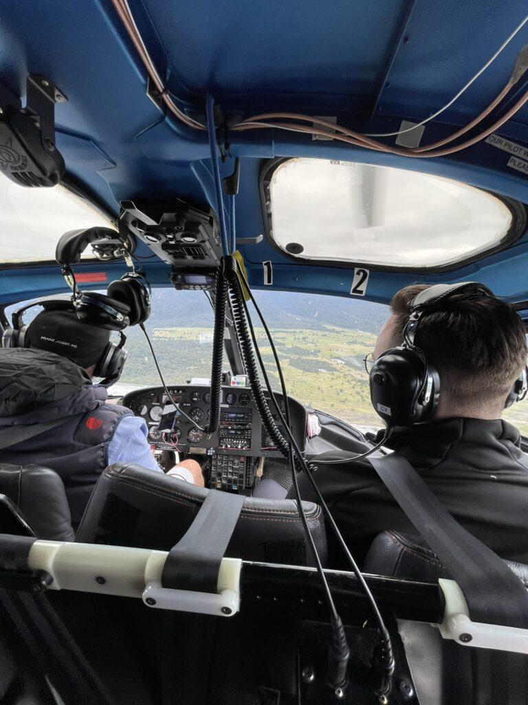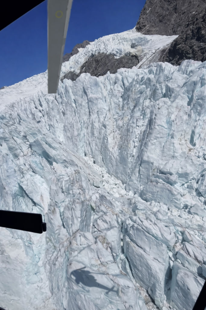 Pakujemy się do helikoptera, a w zasadzie usadza nas pilot, przypina pasy, sprawdza i daje nam słuchawki na uszy. Startujemy i kierujemy się w stronę gór, przelatując najpierw nad pastwiskami, nad rzeką i w końcu wlatujemy w dolinę prowadzącą ku lodowcowi. W helikoterze podczas lotu panuje straszliwy hałes i żeby komunikacja pomiędzy pilotem a pasażerami była cały czas zachowana, mamy właśnie na uszach słuchawki, które po pierwsze wygłuszają otoczenie, a po wtóre słyszymy w nich pilota, który opowaiada nam o trasie i o lodowcu.