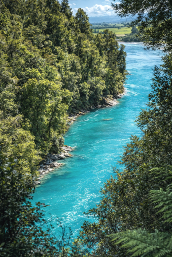 Rzeka Hokitika River ma intensywnie turkusowy kolor, który wygląda jak efekt Photoshopa. A to po prostu fizyka. Woda spływa z lodowcowych obszarów Alp Południowych (Southern Alps), niosąc ze sobą drobny pył skalny, tzw. mączkę lodowcową, która rozprasza światło i nadaje rzece ten niezwykły odcień.
