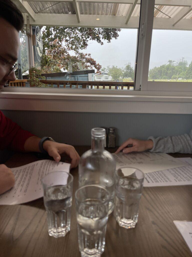 W oczekiwaniu na obiad, w jego trakcie i podczas poobiedniej pogawędki towarzyszyła nam oczywiście woda za free. Pisałem już o tym na początku naszej relacji, ale warto podkreślić to jeszcze raz… w Nowej Zelandii podanie darmowej wody pitnej w restauracji to praktycznie standard. Bez pytania, bez krzywienia się, bez dopisywania jej do rachunku… siadasz do stolika i od razu pojawia się woda. Mała rzecz, a cieszy. I trochę ułatwia życie podróżnikowi, który liczy każdego dolca, żeby starczyło na kolejne kilometry drogi.