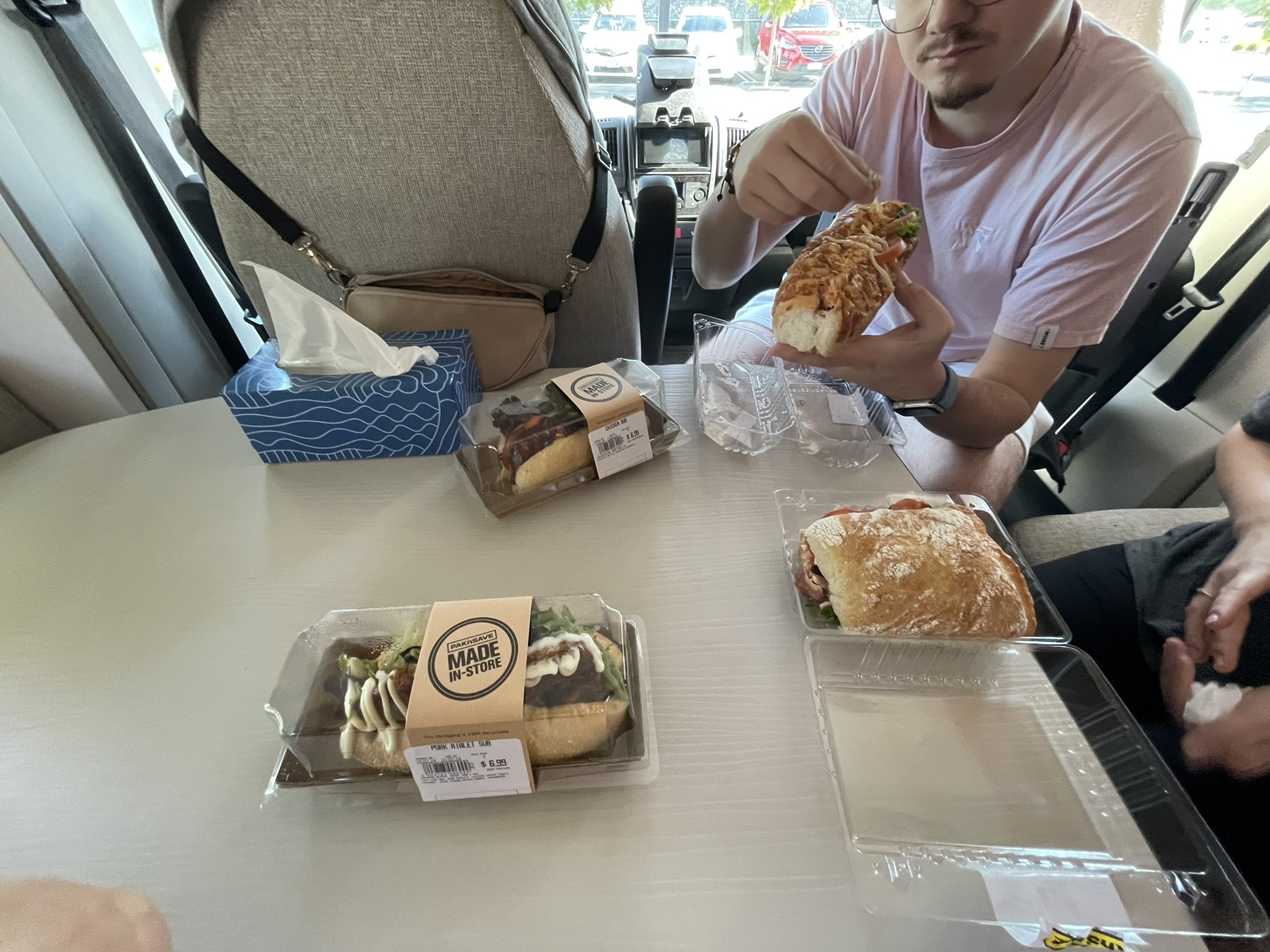 Dzisiejszy poranek był dość… szybki. Bez leniuchowania. Przed nami było ponad 300 kilometrów drogi, a plan zakładał jeszcze kilka przystanków „tu i tam”, więc nie było miejsca na zwłokę. Spakowaliśmy się sprawnie, standardowa obsługa naszej FAYSIE, szybkie zakupy na kolejne dni i już wiedzieliśmy, że na spokojne śniadanie nie ma co liczyć. Decyzja zapadła błyskawicznie… jemy coś „kupnego” po drodze. Po prostym, kanapkowym śniadaniu ruszyliśmy w trasę.