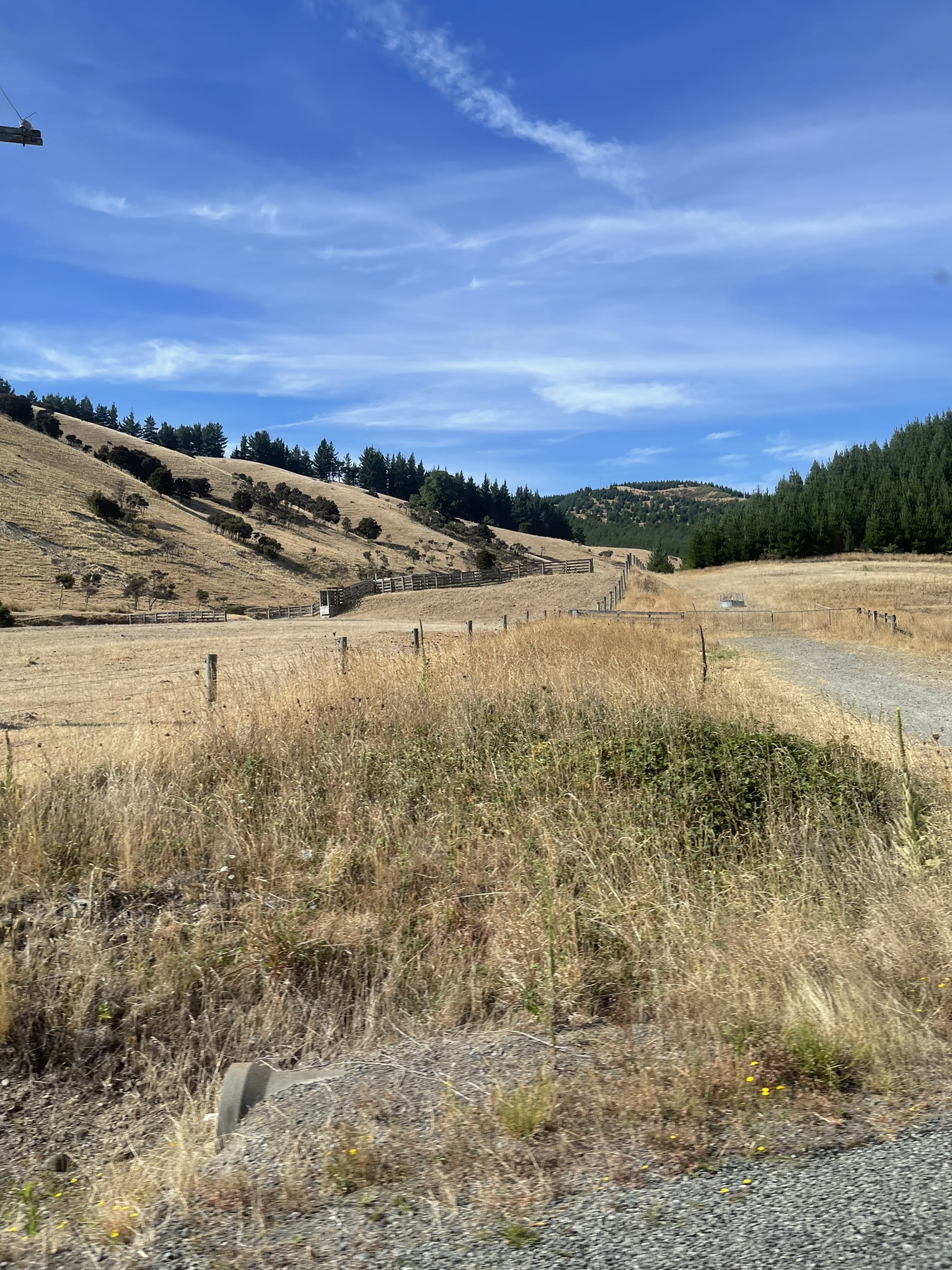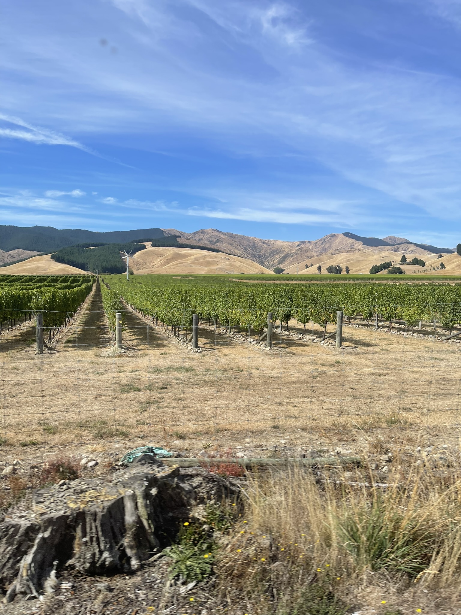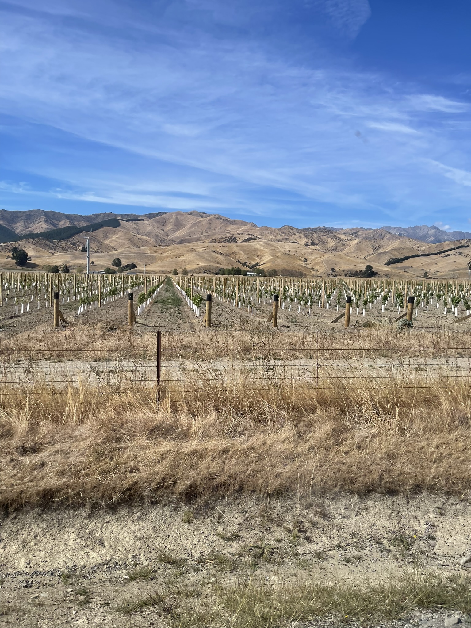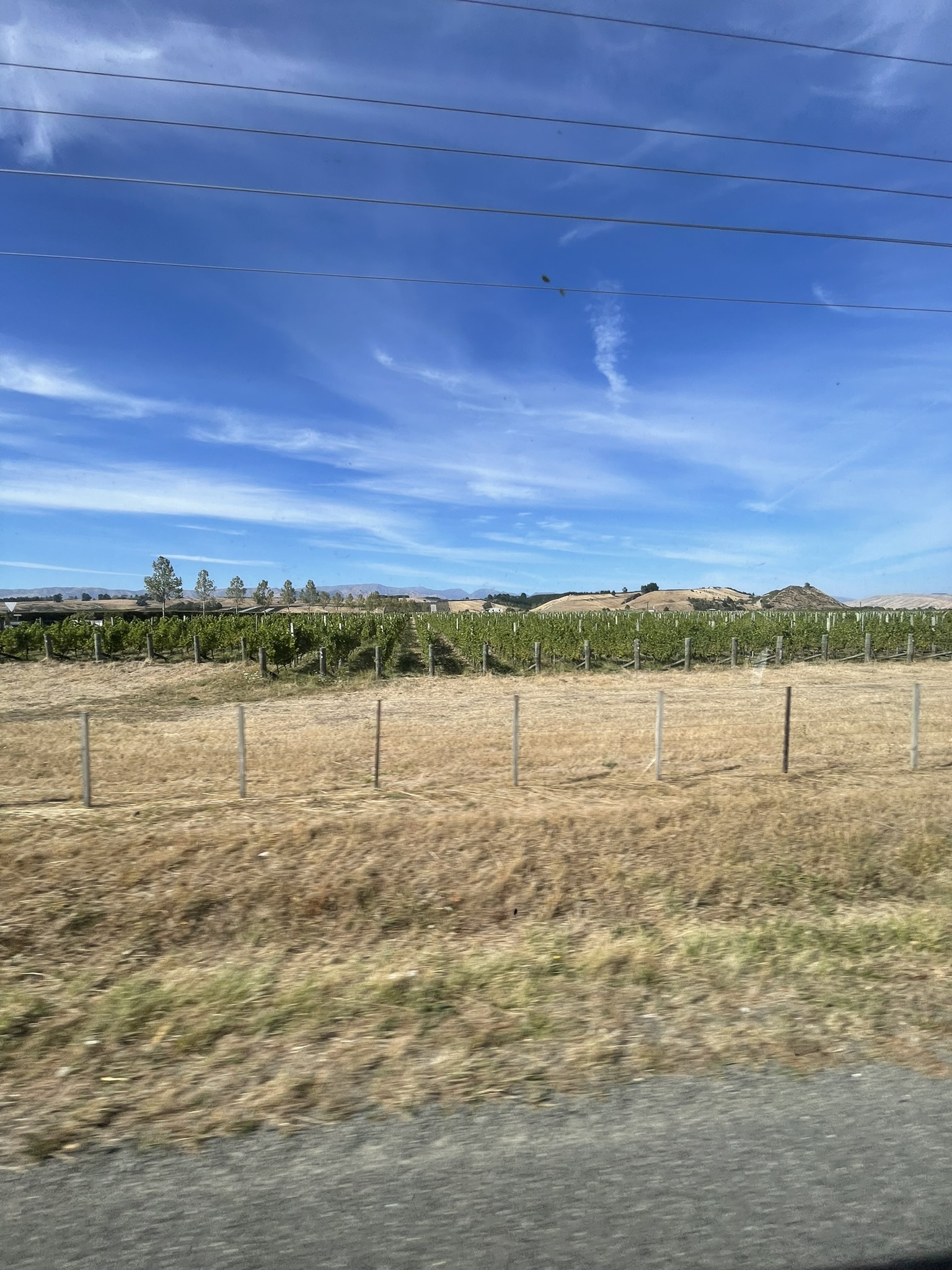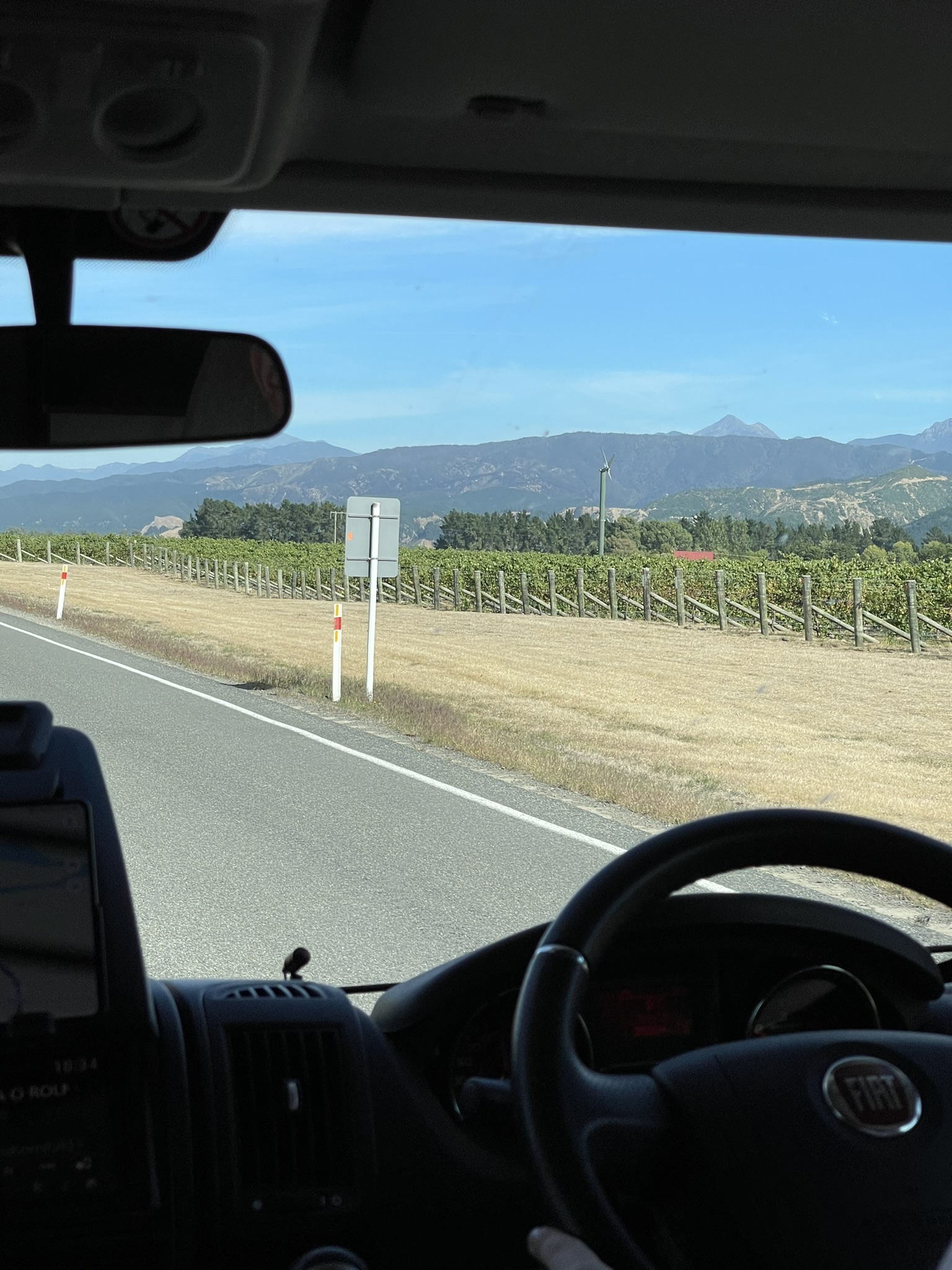 Z każdym kilometrem coraz wyraźniej było widać, że to już inne oblicze Nowej Zelandii niż to, które pamiętaliśmy z Wyspy Północnej. Zamiast krajobrazów znanych z wcześniejszych odcinków drogi pojawiły się rozległe równiny, a w tle coraz częściej rysowały się góry, które domykały horyzont. Idealne miejsce na winnice… i rzeczywiście, to one zdominowały krajobraz.
