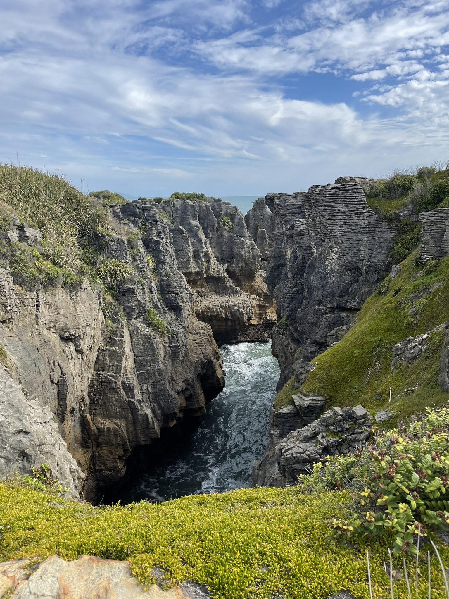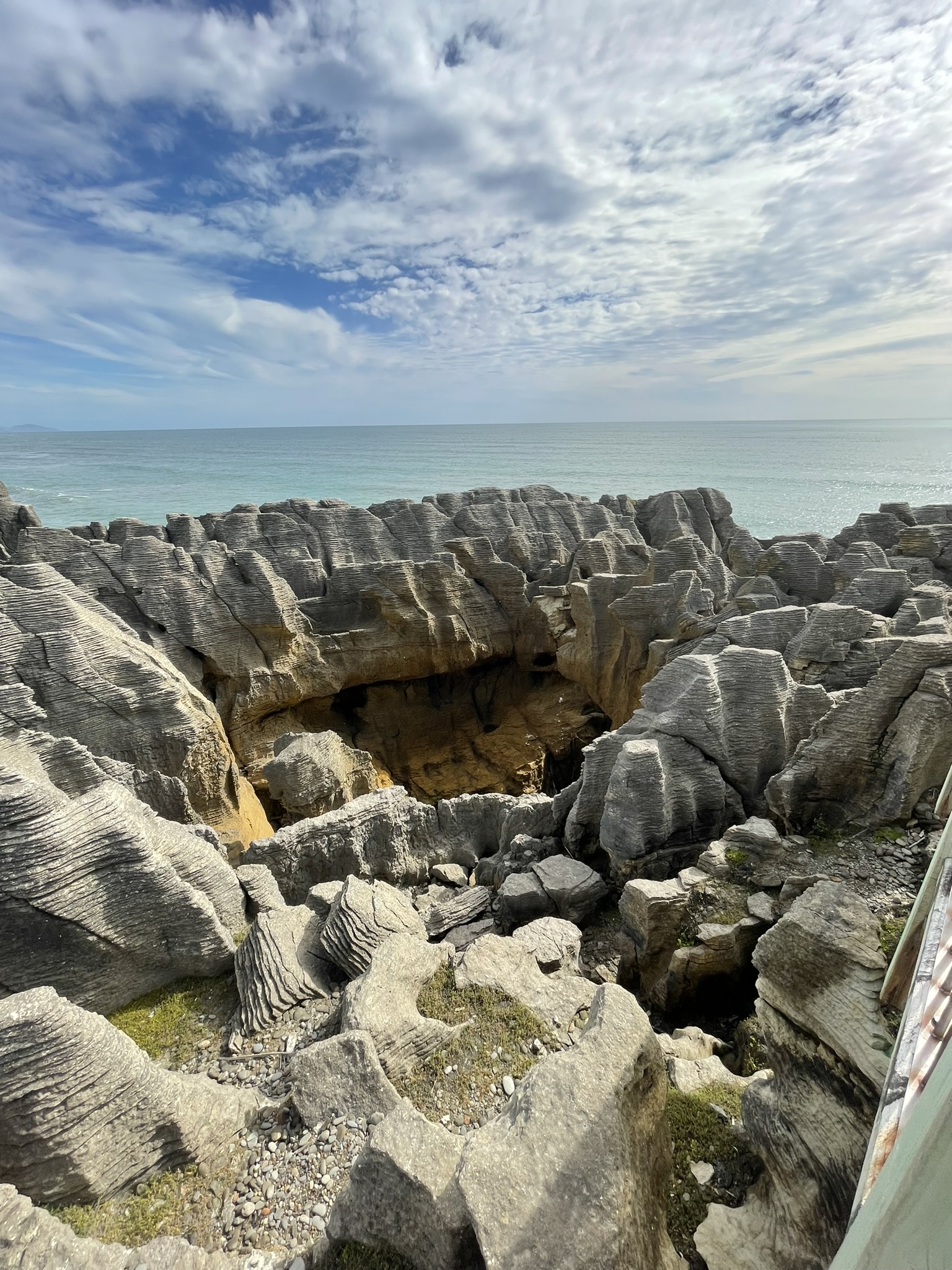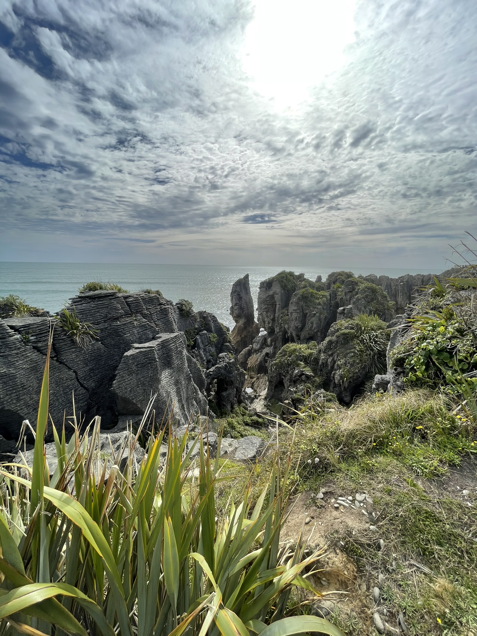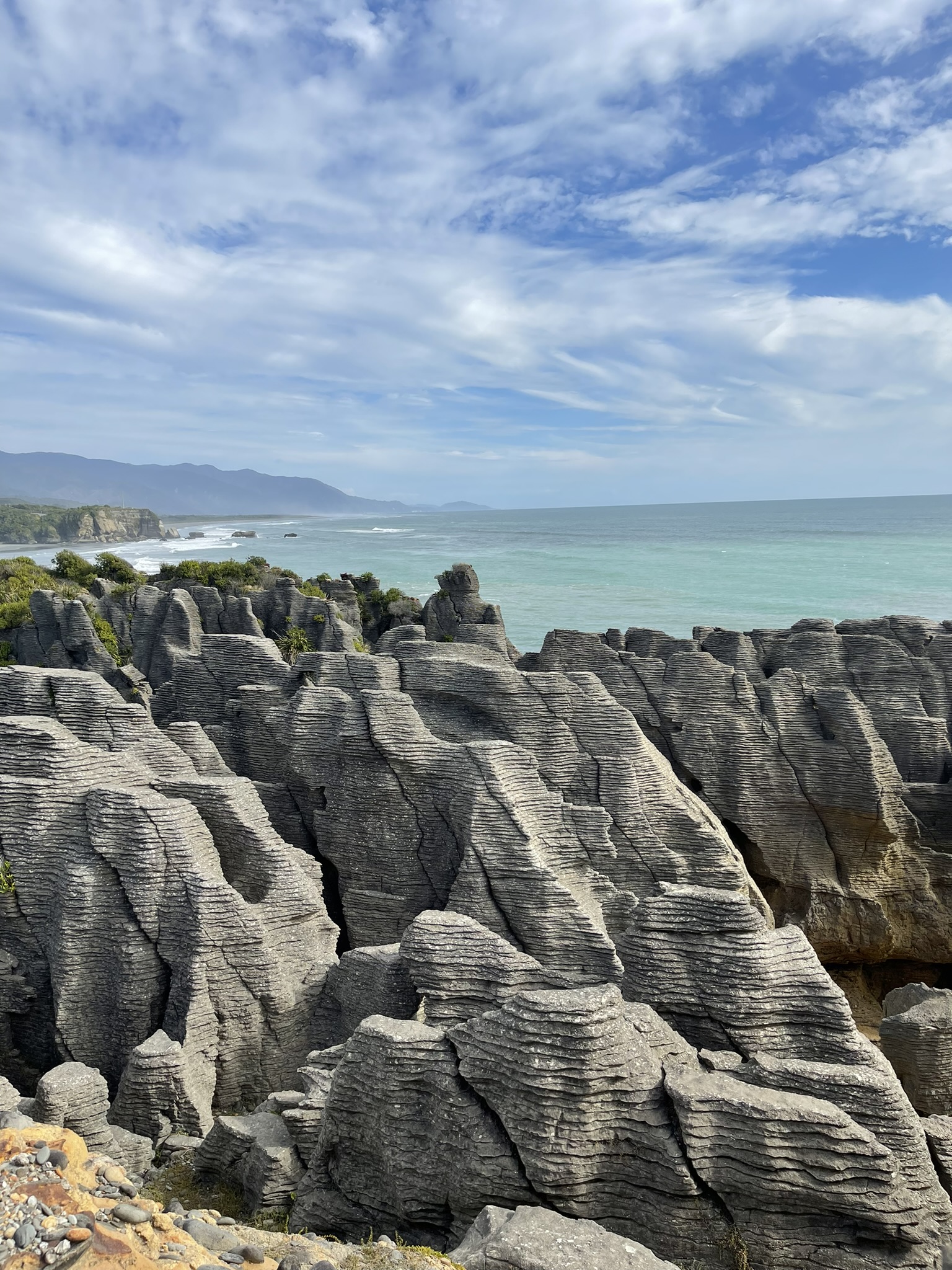 Ufff… jesteśmy na miejscu. Skały wyglądają dokładnie tak, jak sugeruje ich nazwa – warstwa na warstwie, jak idealnie ułożone naleśniki. Ten niezwykły układ nie jest dziełem przypadku. Pancake Rocks powstały z osadów morskich odkładających się na dnie oceanu miliony lat temu, sprasowanych pod ogromnym ciśnieniem i wyniesionych ku górze przez ruchy tektoniczne. Później natura zrobiła swoje. Wiatr, deszcz i przede wszystkim morze przez tysiące lat rzeźbiły skałę, wygładzając ją i rozdzielając na charakterystyczne poziome „placki”.