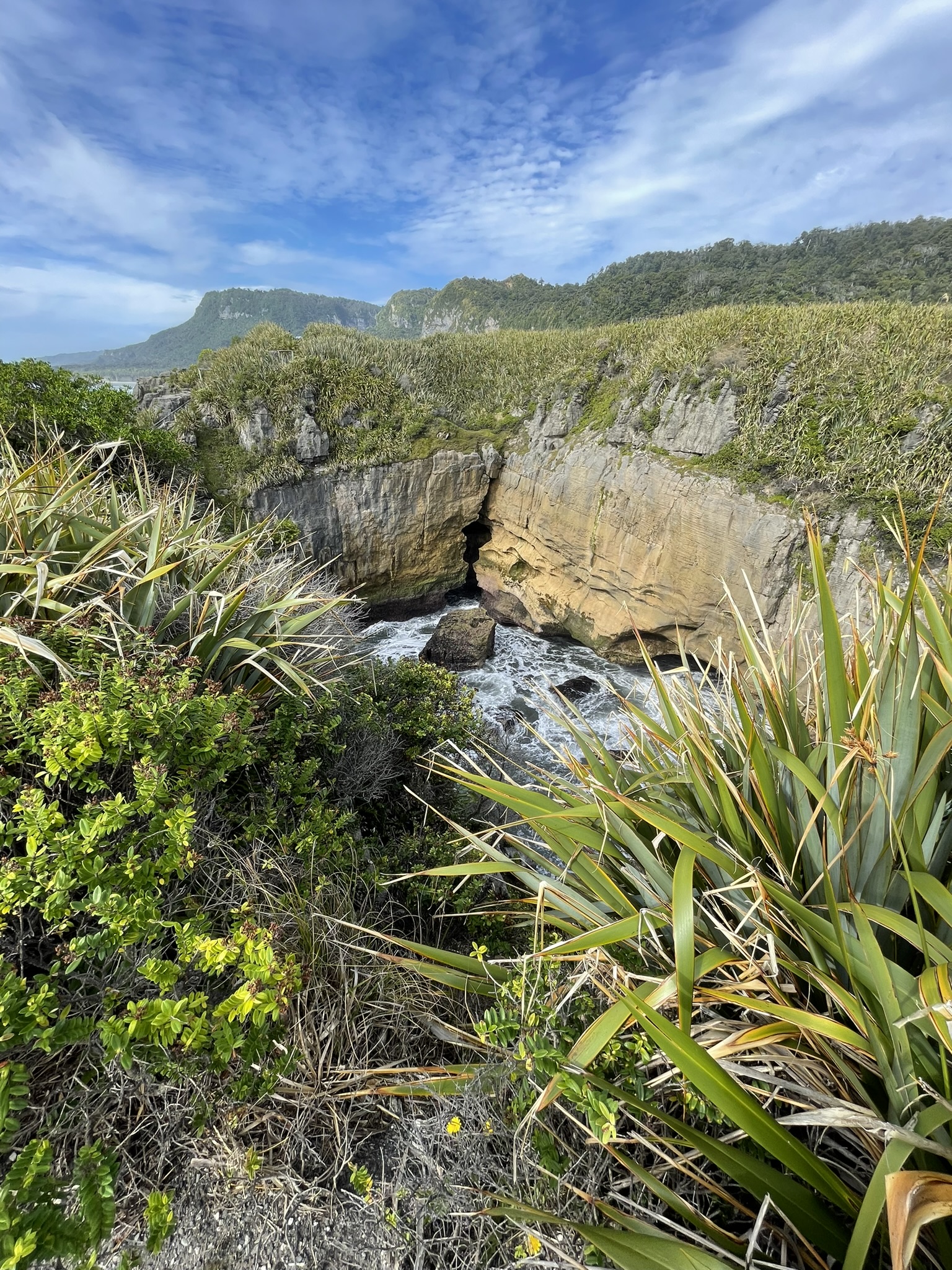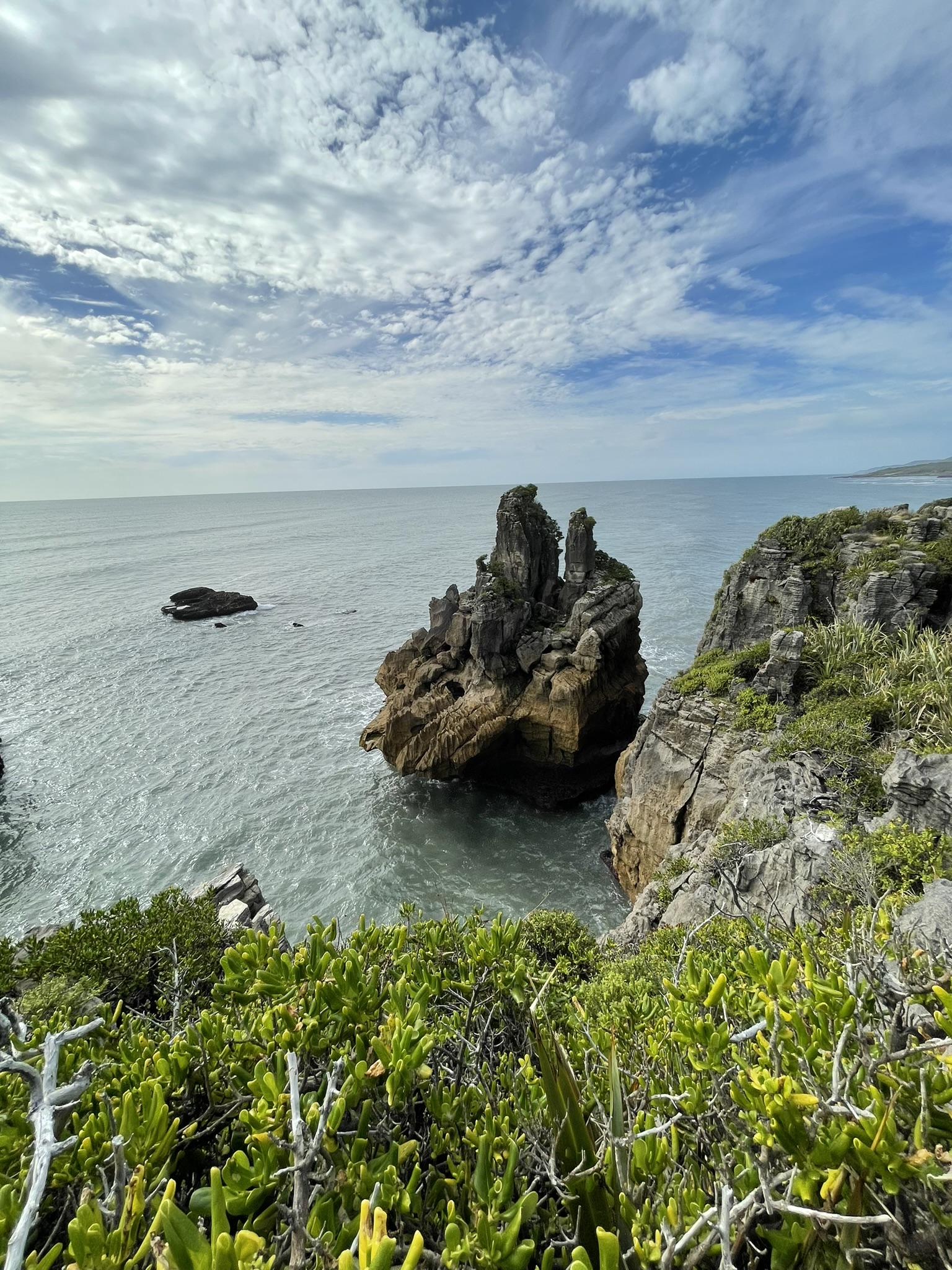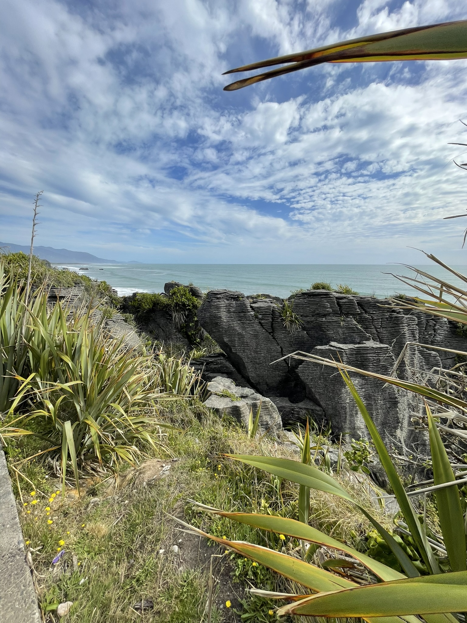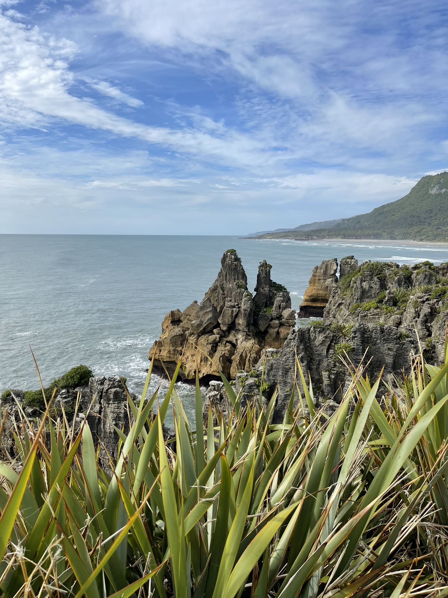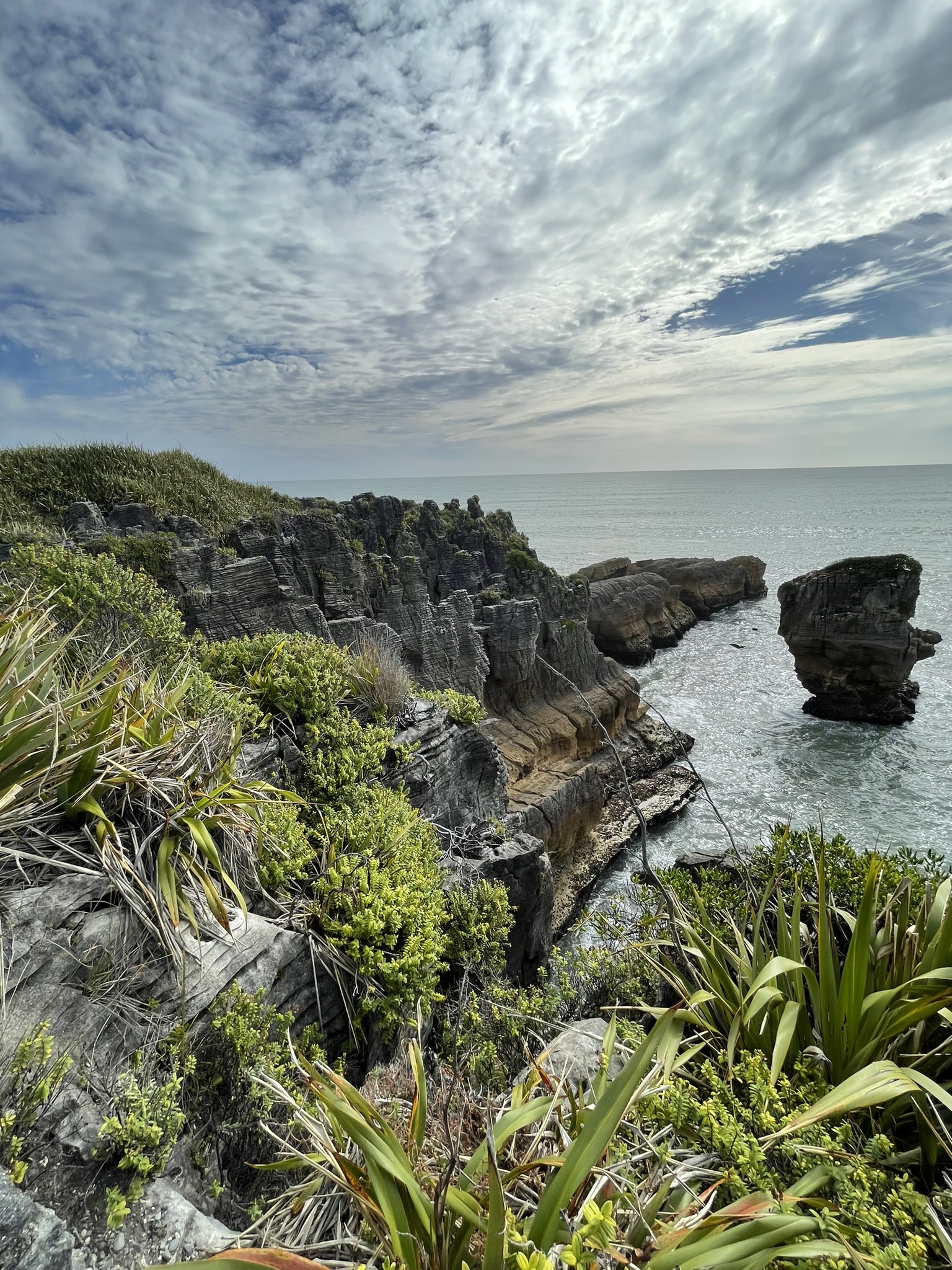 Ufff… jesteśmy na miejscu. Skały wyglądają dokładnie tak, jak sugeruje ich nazwa – warstwa na warstwie, jak idealnie ułożone naleśniki. Ten niezwykły układ nie jest dziełem przypadku. Pancake Rocks powstały z osadów morskich odkładających się na dnie oceanu miliony lat temu, sprasowanych pod ogromnym ciśnieniem i wyniesionych ku górze przez ruchy tektoniczne. Później natura zrobiła swoje. Wiatr, deszcz i przede wszystkim morze przez tysiące lat rzeźbiły skałę, wygładzając ją i rozdzielając na charakterystyczne poziome „placki”.