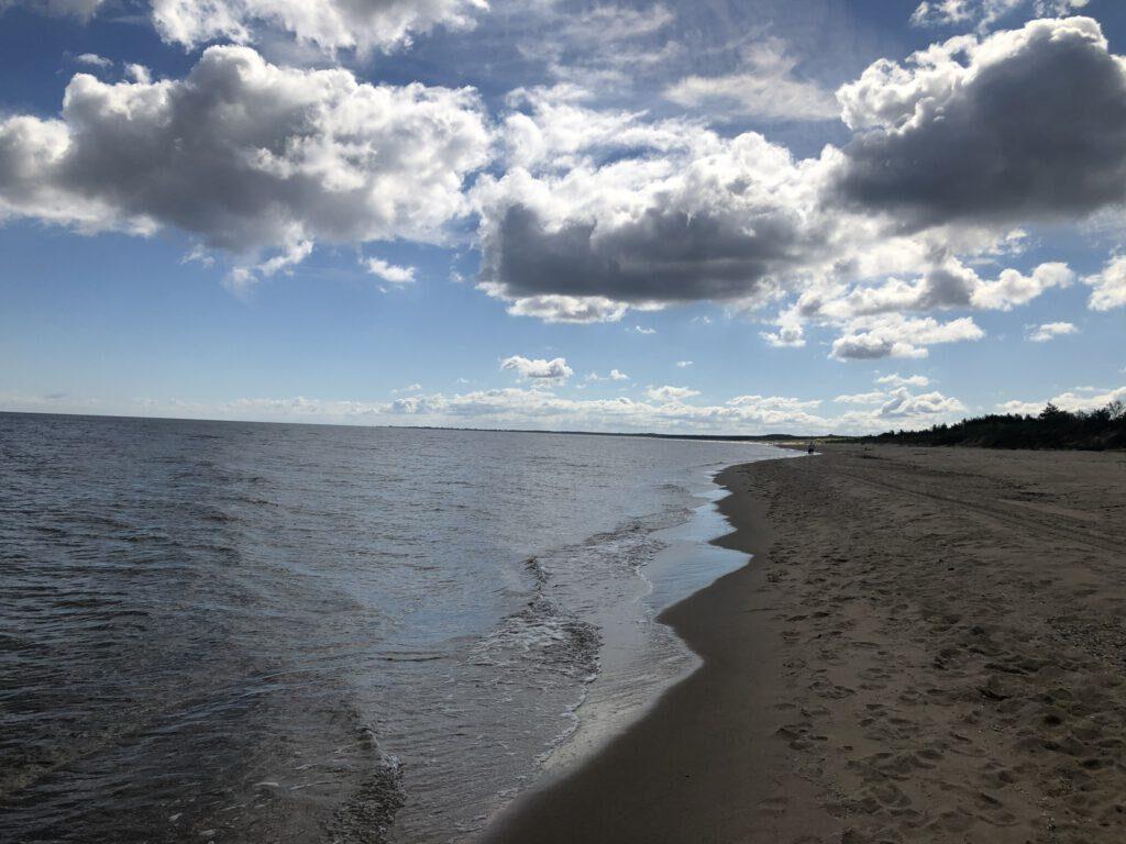 Z początku lasem w kierunku Rezerwat przyrody Ptasi Raj, a potem już brzegiem Zatoki. Pogoda dopisywała – piękne błękitne niebo z grzejącym słońcem delikatnie przysłaniamym od czasu do czasu rozsianymi chmurkami. Szum niewielkich fal rozbijających się o brzeg plaży i krzyk mew dopełniał moje wspaniałe samopoczucie.